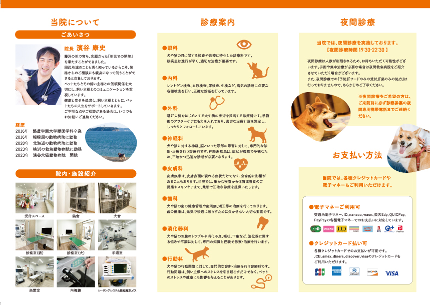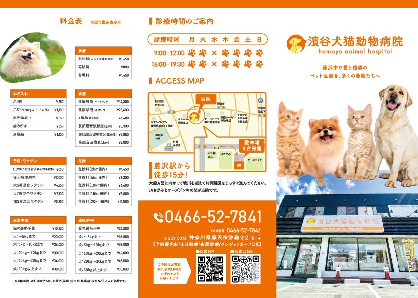 最先端の医療技術と心を込めた診察 当院では、ペットたちが健康で幸せな暮らしを送ることができるよう、 最先端の医療技術と心を込めた診察を行うことを目指しております。 私たちは、「動物たちが元気であることが、飼い主様の幸せにつながる」という思いを大切にしております。 そのために、安全かつ効果的な治療を、丁寧にペットたちと向き合いながら行います。 また、藤沢市を含め地域社会に貢献することも大切に考えております。 地域のボランティア活動や啓蒙活動に積極的に参加し、ペットたちが地域社会の一員として、健康で幸せに暮らせるよう、努力してまいります。 私たちは、地域の皆様の信頼と期待に応えるため、日々精進してまいります。 病院名 濱谷犬猫動物病院 所在地 神奈川県藤沢市弥勒寺2-6-4 TEL 0466-52-7841 FAX 0466-52-7842 夜間対応について ※夜間対応を希望される方はご来院前に必ず診察券裏の夜間専用携帯電話にご連絡ください。 夜間診療は人数が制限されるため、お待ちいただく可能性がございます。 それに際して、手術や集中治療が必要な場合は夜間救急病院をご紹介させていただく可能性もございます。予め、ご了承ください。 また、夜間診療での予防、フードのみの受付、薬のみの処方は行っておりません。 緊急対応について 当院では、緊急対応を行うことがございます。 緊急対応中は受付、電話対応、診療をすべて一時ストップします。 お待たせしてしまう可能性がございますので、予めご了承ください。 病院紹介パンフレット 院内見取り図 院内紹介 待合(犬) 待合(猫) 診察室(犬) 犬舎 診察室(猫) 猫舎 大型犬専用 手術室 処置室 機器紹介 エコー検査装置 オートクレーブ ガス滅菌装置 麻酔器とモニター 電気メス装置 内視鏡